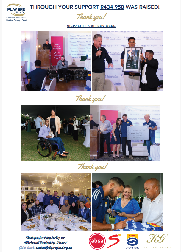 The funds raised—totaling R434,950—will go directly towards life long care for catastrophically injured rugby players in South Africa.