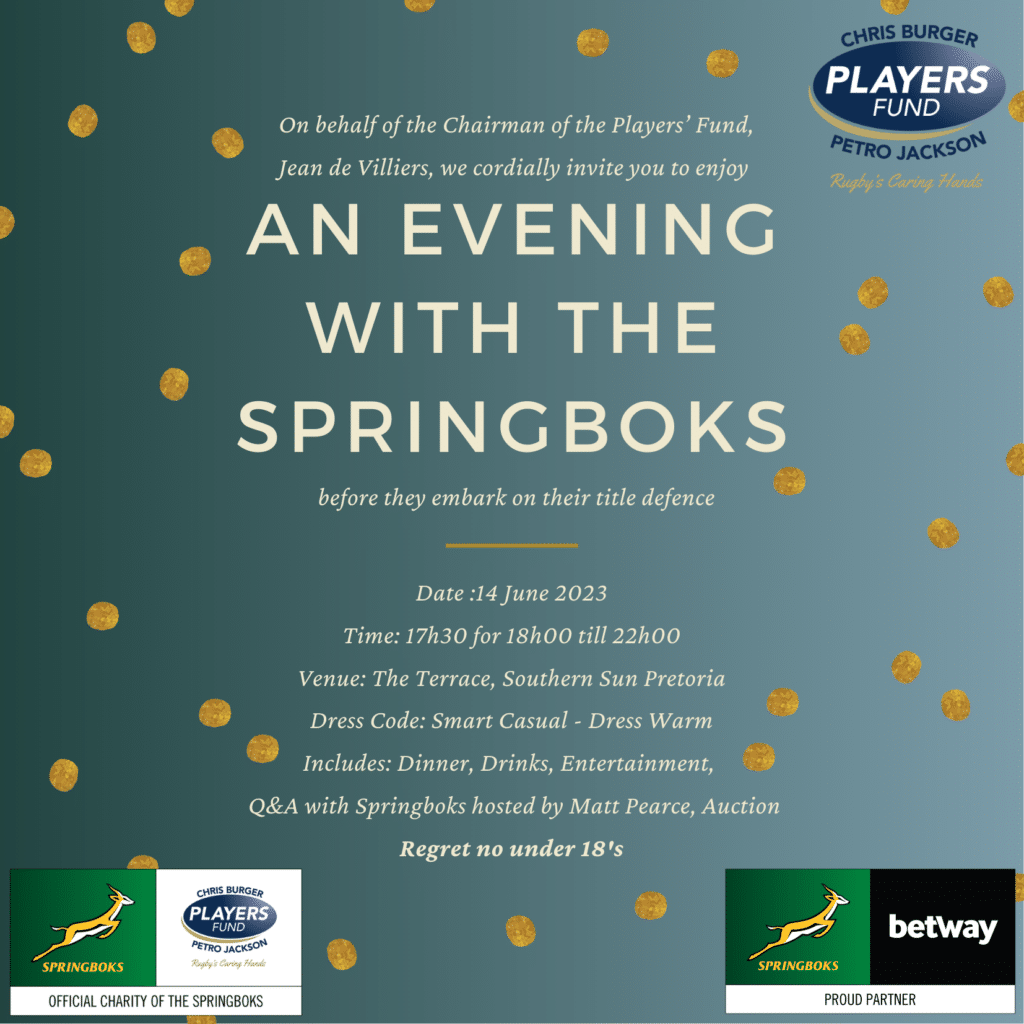 As the official charity of the Springboks, we are one of only a few organisations that can access the entire Springbok squad for an event, presenting a unique opportunity to meet the team, coaches and management 🏉